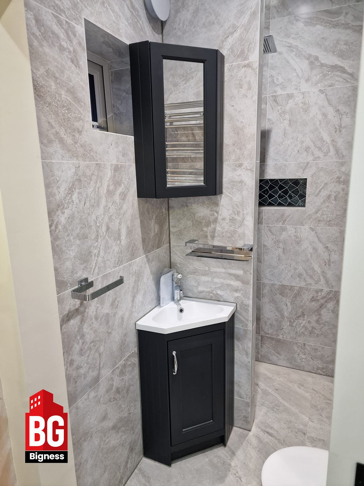 - Installation of black vanity unit and mirror cabinet.