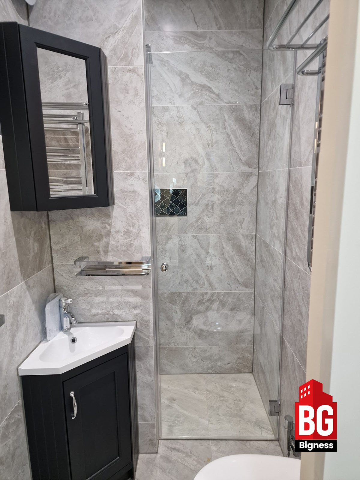 - New shower enclosure, brassware, and towel rail installation.