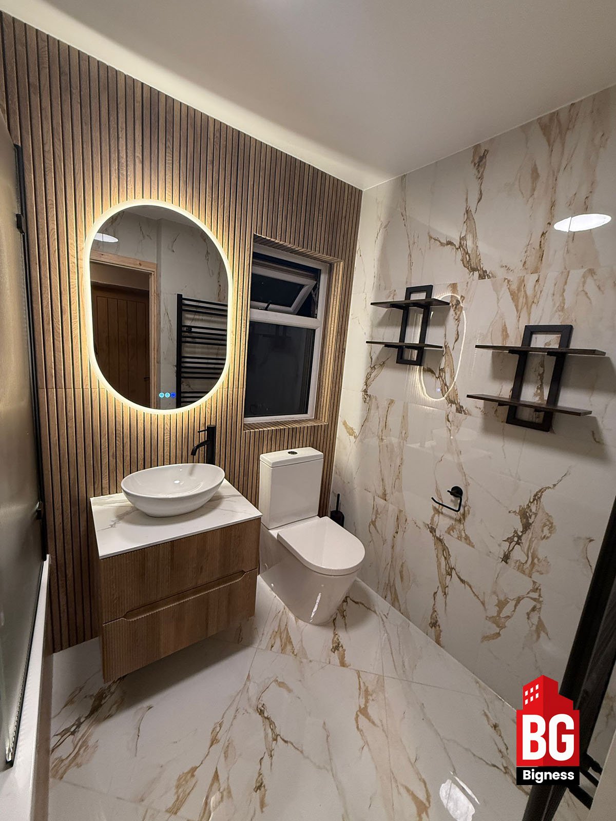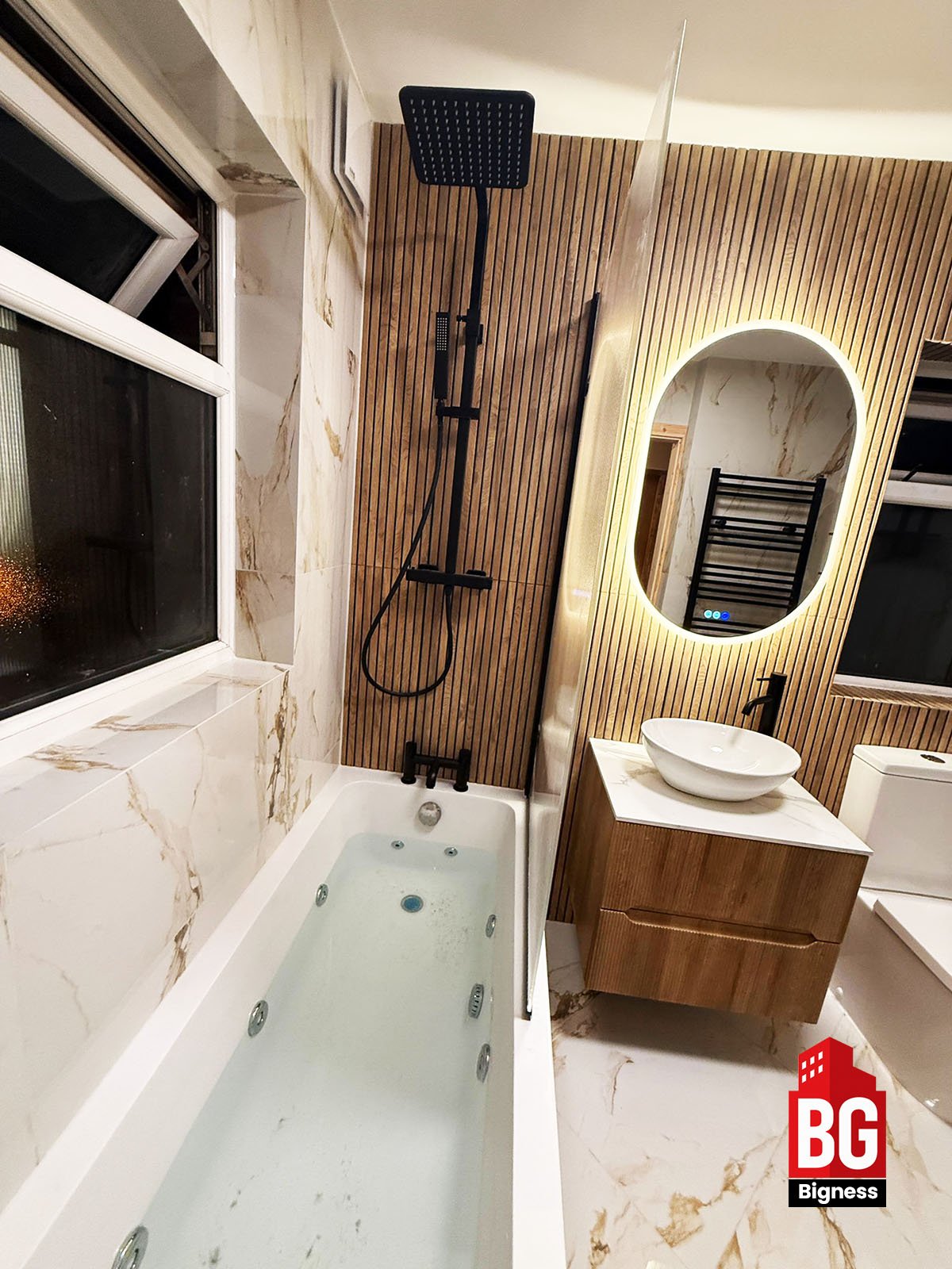 - Installation of bathtub, rainfall shower, WC, and vanity unit.