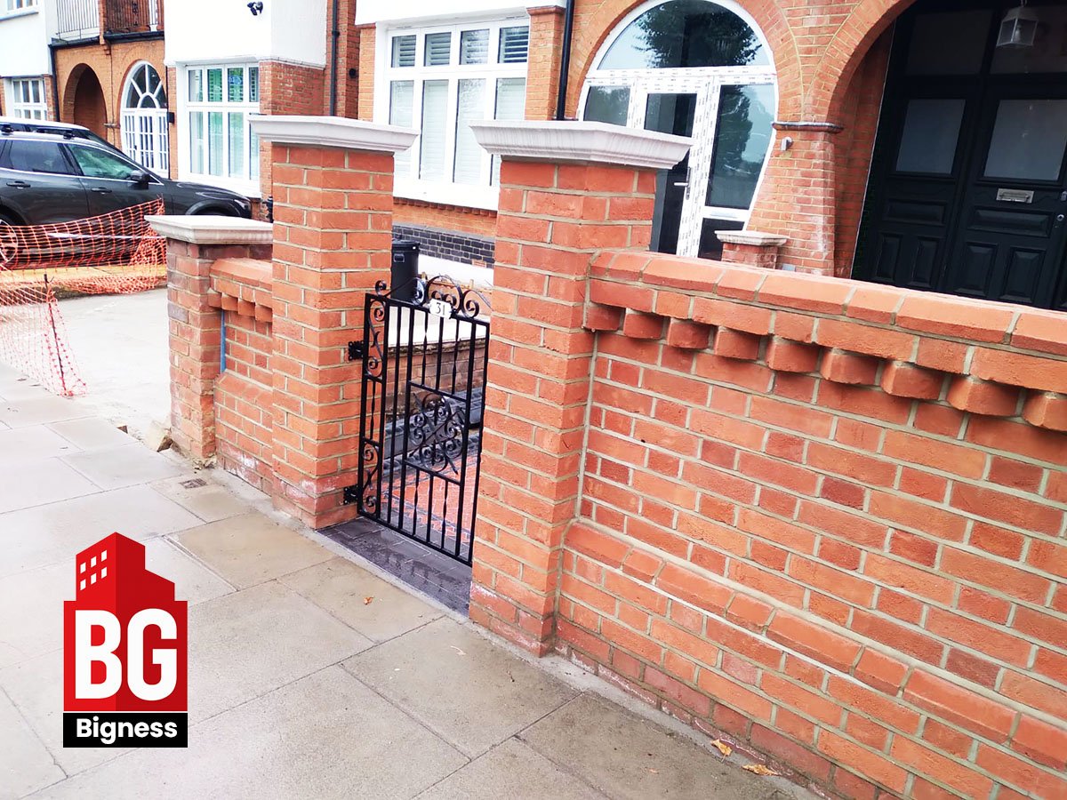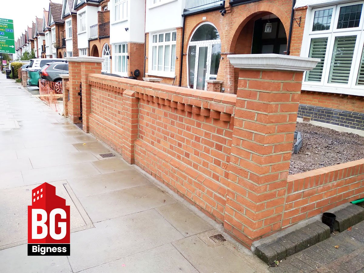 - Brick boundary fence construction with piers and caps.
